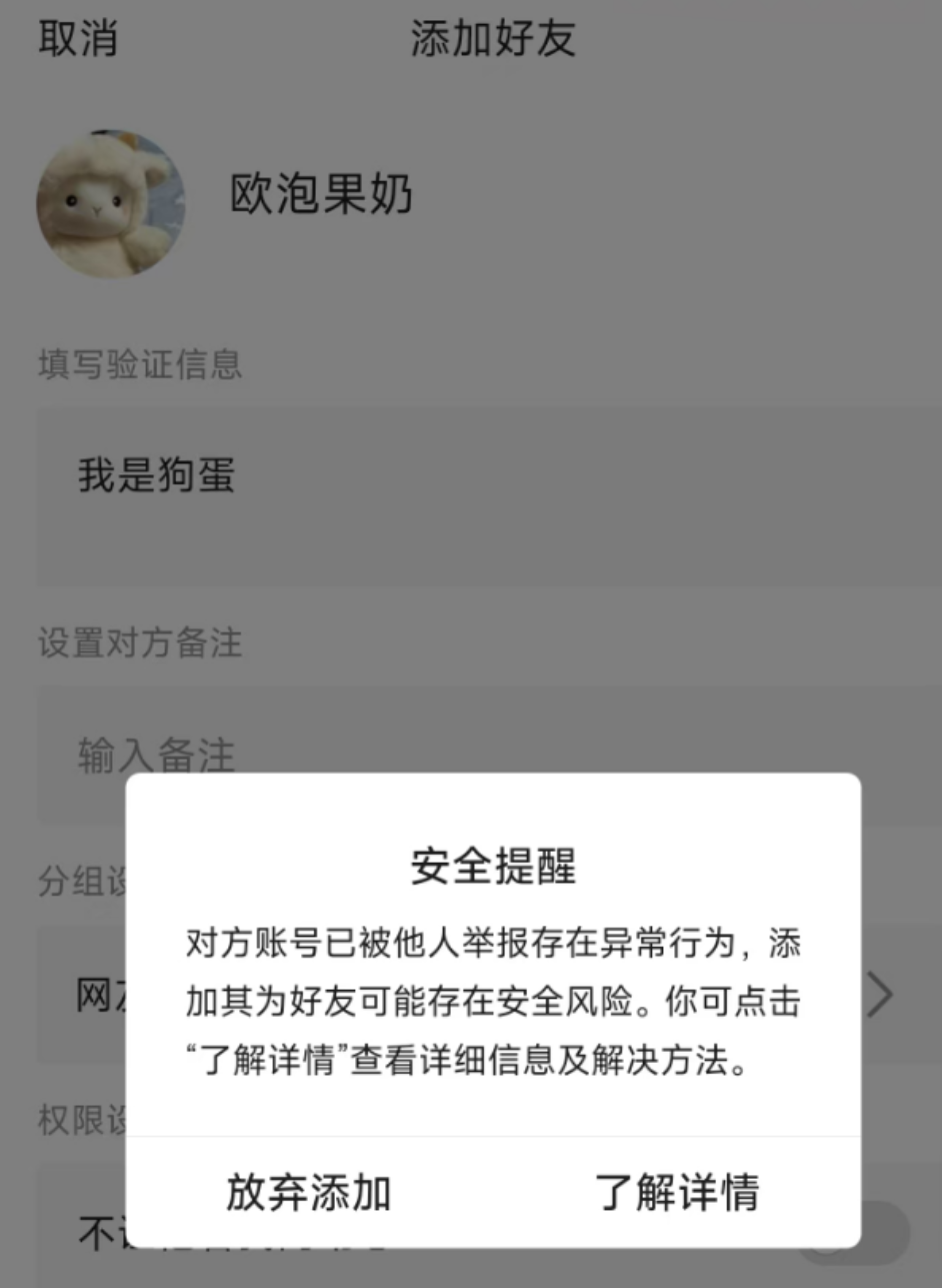 常见问题 2026-04-01 最新QQ加好友风险弹窗教程 最新QQ加好友风险弹窗教程操作方法: 1:把号设置成允许任何人添加 可能可以避免被加好友风险 可以自行测试下 2:或者等系统自行恢复 一般15天甚至1个月左右会自动恢复不提示~(为什么出现这种情况? 一般是因为异地 就会这样 ) < 上一篇 请勿屏幕共享,防止QQ号被盗! 下一篇 > 最新版QQ 即可秒绑手机! ← 返回首页